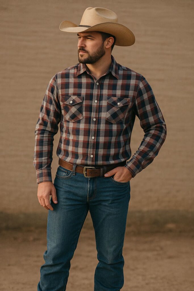 Camisa xadrez, calça jeans e bota são o trio clássico que nunca falha. Para um toque mais urbano, aposte em camisas lisas e cintos de fivela discreta. Evite misturar elementos exagerados — o chapéu por si só já é o protagonista.