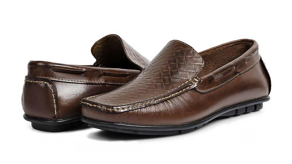 Um loafer com textura geométrica funciona bem com calça chino e suéter leve. É o tipo de produção que passa conforto e estilo na medida certa.